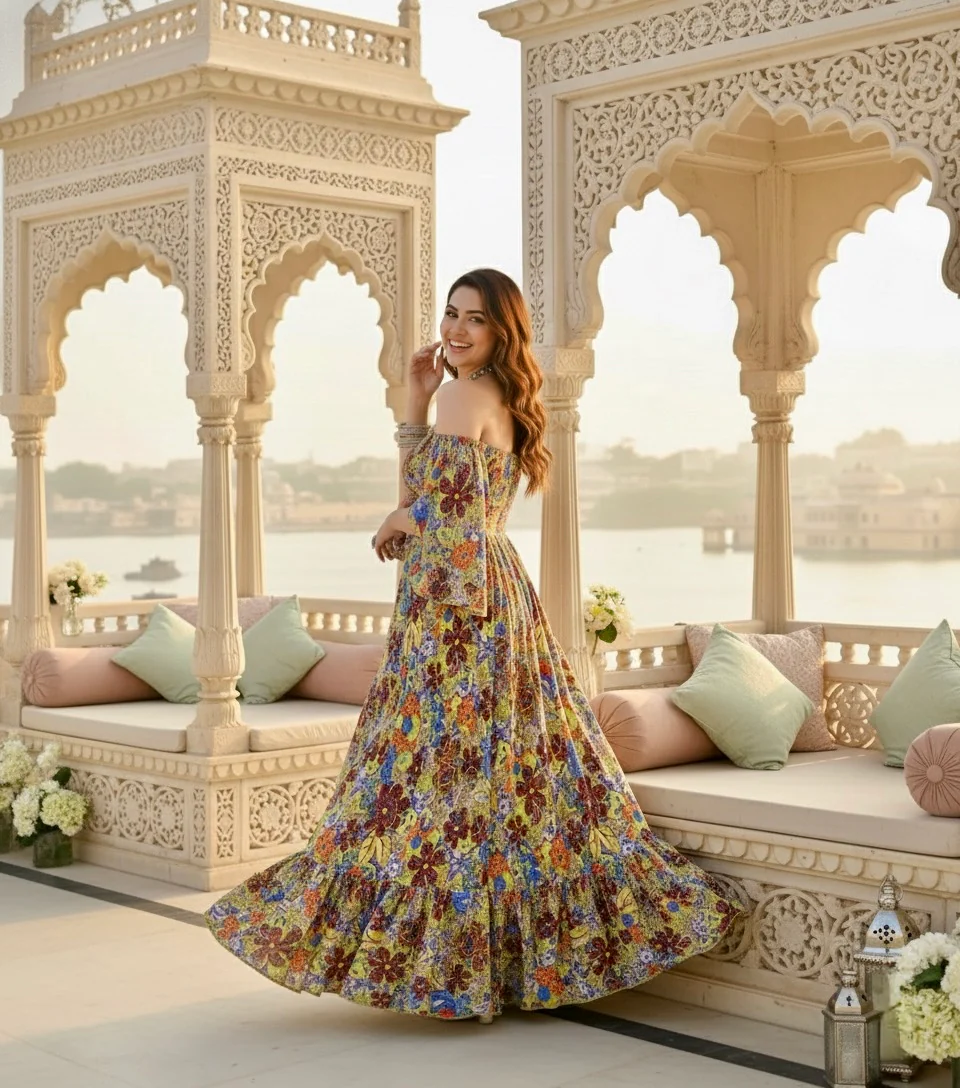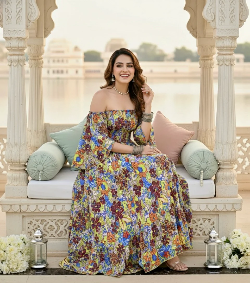 Bare-Shoulder Beauty Dress -Emerald Flora