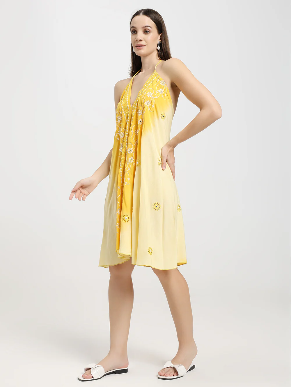 EMBROIDERED SHORT TIE BACK BACKLESS MAXI DRESS- YELLOW