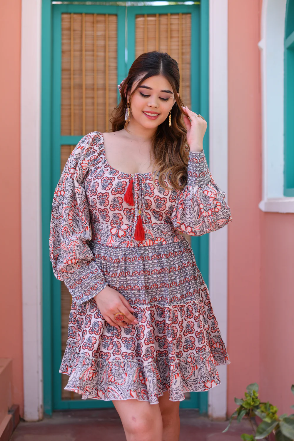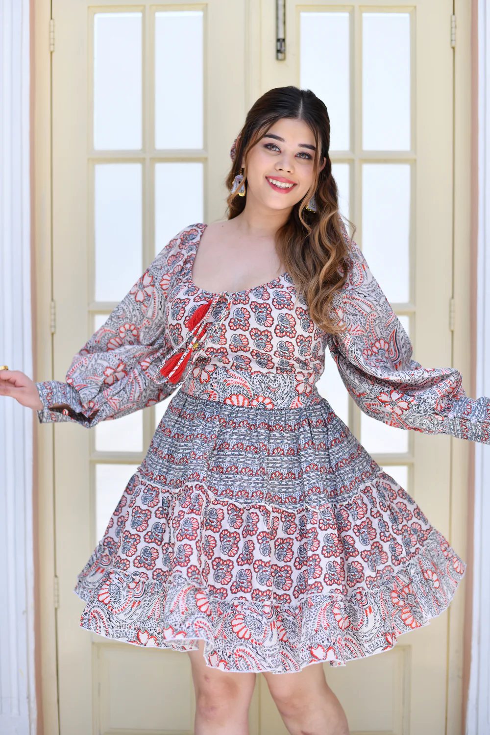 Crimson Bloom Puff Sleeves Cotton Short Dress (Copy)