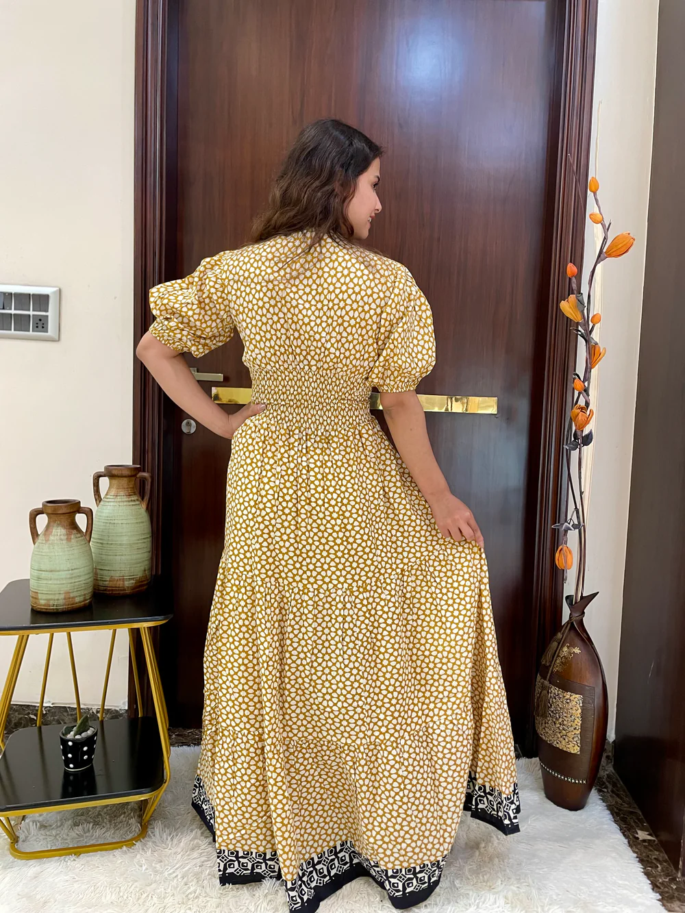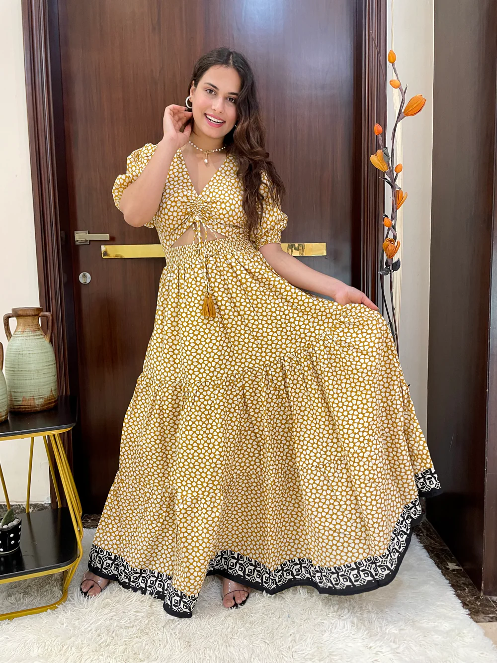 Puff Sleeves Cut Out Pattern Long Dress