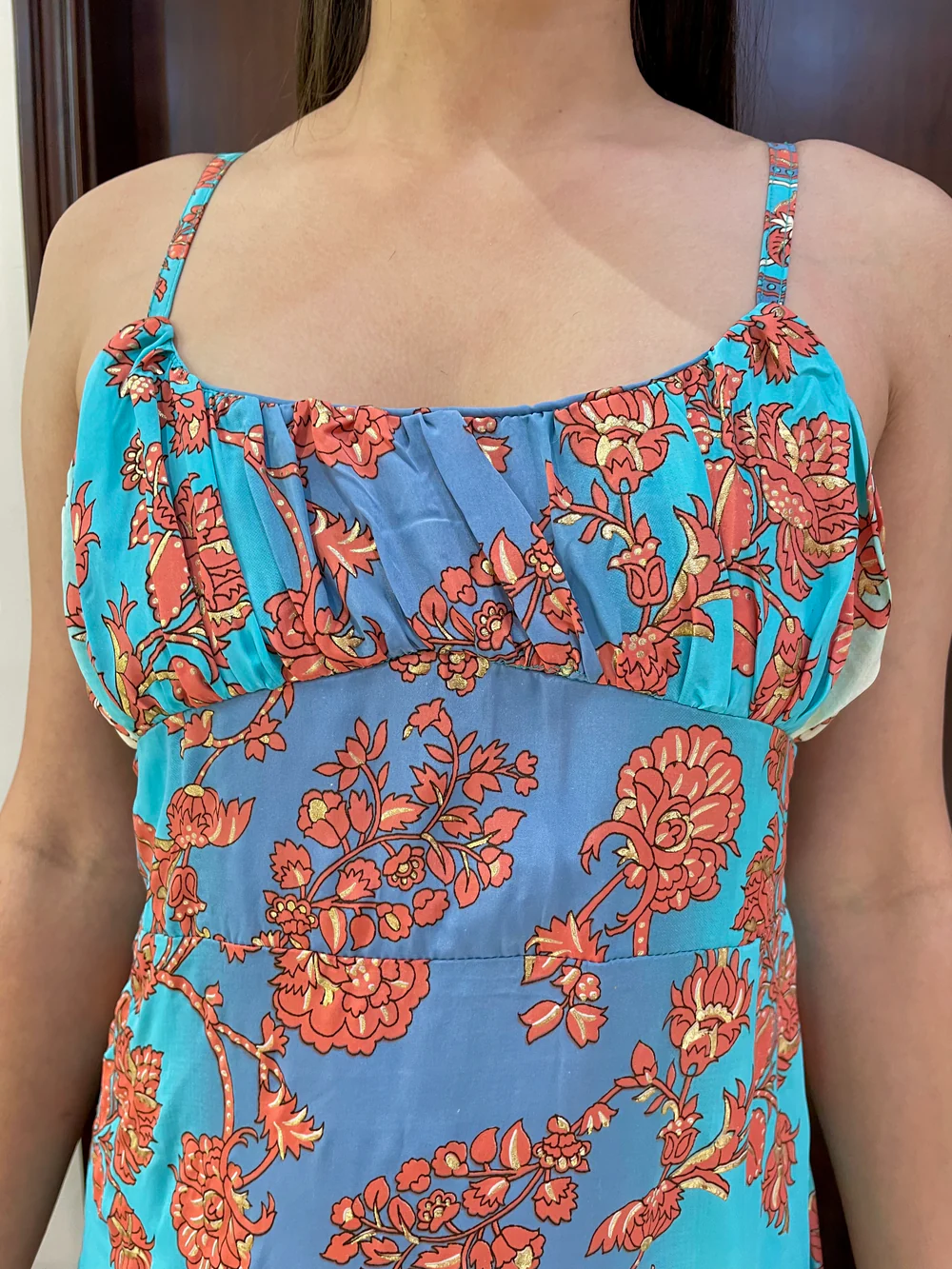 Ruched bust ruffle hem gold (foil) print featured boho midi dress